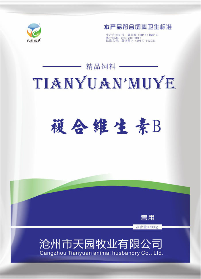 【原料组成】维生素B1、维生素B2、维生素B6、维生素B12、烟酸、泛酸钙、叶酸等;抗氧化剂: 乙氧基喹啉,载体: 葡萄糖。【产品成份分析保证值】(每千克中含量不低于) : 【感官标准】浅黄色至黄褐色粉末。色泽均匀一致,无结块、无霉变及异味异嗅,具维生素固有气味。【卫生标准】 【用法用量】混饮:本品200克兑水3000千克供畜禽全天饮用。 混饲: 本品200克拌料1500千克供畜禽全天 饲喂。【贮存条件】密闭,阴凉,干燥保存。【包装规格】200g/袋【保质期限】18个月