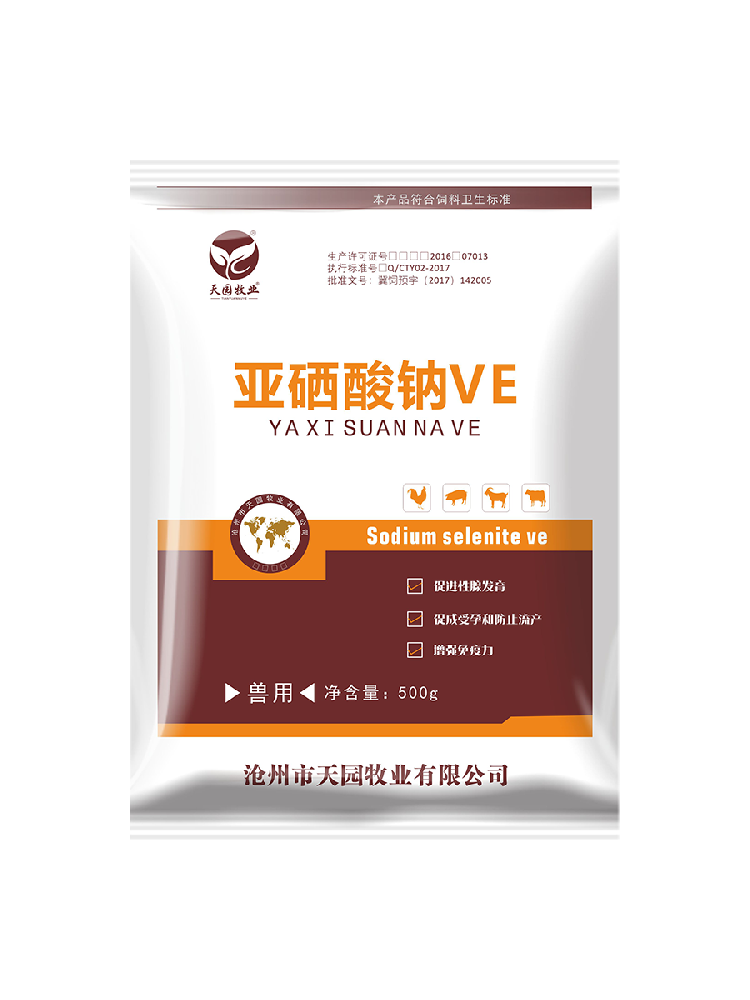 【主要成份及化学名称】本品1000g含0.4g亚硒钠,5g维生素E(100%)亚硒酸(Na2s03)VE(±)-2,5,7,8-四甲基- 2(4,8,12-三甲基十三烷基)-6-苯并二氢吡喃醇醋酸酯。