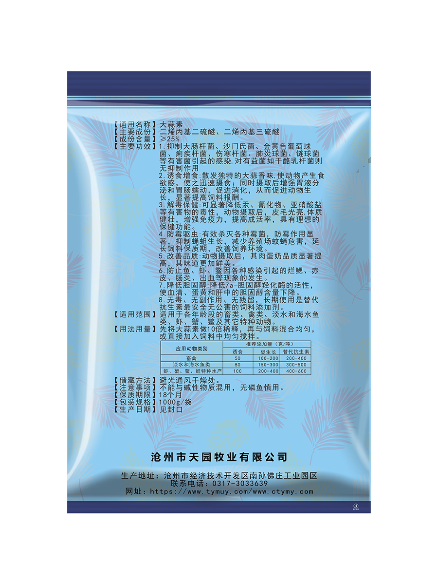 【用法用量】先将本品做10倍稀释,再与饲料混合均匀,或直接加入饲料中均匀搅拌。
