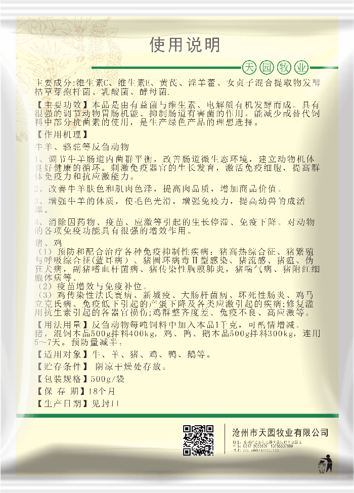 主要成分:维生素C、维生素E、枯草芽孢杄菌、乳酸菌、酵母菌,载体:黄芪、淫羊藿、女贞子.【用法用量】反刍动物每吨饲料中加入本品1千克,可酌情增减。猪,混饲本品500g拌料400kg,鸡、鸭、鹅本品500g拌料300kg,连用5~7天。预防量减半。【适用对象】牛、羊、猪、鸡、鸭、鹅等。【包装规格】500g/袋,20袋/件