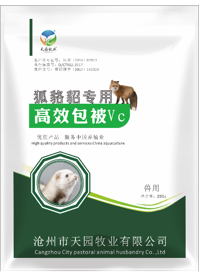 【有效成分】VC(VC含量20%)【用法用量】直接拌入饲料中,混合均匀后长期饲喂。1.产后20天的母兽:按0.1克每只每天添加,提高生长速度和减少腹泻;2.分窝一周前后的小崽:按0.01克每只每天添加,减少分窝时候的自咬;3.高温、气候骤变及动物疾病期间:每0.1克每只每天添加;4.免疫前后2天:按0.02克每只每天添加,可以减少生长速度降低包装规格:250克/袋,30袋/桶