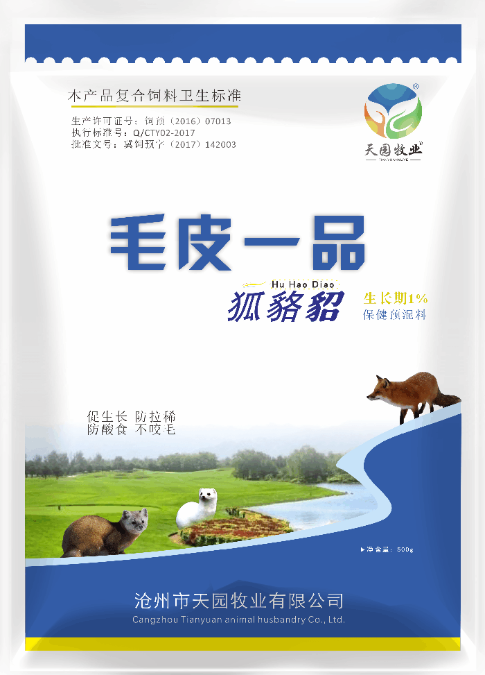 【主要成分】维生素A、维生素D、维生素E、维生素K、维生素B1、维生素B2、维生素B6、维生素B12、泛酸、烟酸、叶酸、抗坏血酸、生物素、氯化胆碱、甘氨酸亚铁、甘氨酸铜、蛋氨酸铬、赖氨酸锌、碘化钾、亚硒酸钠、蛋氨酸、抗氧化剂、食盐等。【使用方法】1.貂:每只每日饲喂本品1g2.狐:每只每日饲喂本品2g3.貉:每只每日饲喂本品2g【包装】1000g/袋,15袋/件。